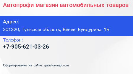 Автопрофи, магазин автомобильных товаров по адресу 301320, Тульская область, Венев, Бундурина, 1Б в дальнейшем Организация, размещена в следующих категориях: