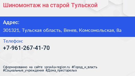 Шиномонтаж на старой Тульской по адресу 301321, Тульская область, Венев, Комсомольская, 8а в дальнейшем Организация, размещена в следующих категориях: