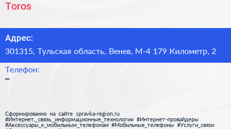 Toros по адресу 301315, Тульская область, Венев, М-4 179 Километр, 2 в дальнейшем Организация, размещена в следующих категориях:
