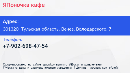 ЯПоночка, кафе по адресу 301320, Тульская область, Венев, Володарского, 7 в дальнейшем Организация, размещена в следующих категориях: