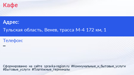 Кафе по адресу Тульская область, Венев, трасса М-4 172 км, 1 в дальнейшем Организация, размещена в следующих категориях: