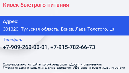 Киоск быстрого питания по адресу 301320, Тульская область, Венев, Льва Толстого, 1а в дальнейшем Организация, размещена в следующих категориях: