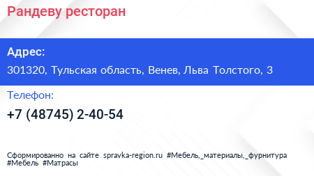 Рандеву, ресторан по адресу 301320, Тульская область, Венев, Льва Толстого, 3 в дальнейшем Организация, размещена в следующих категориях: