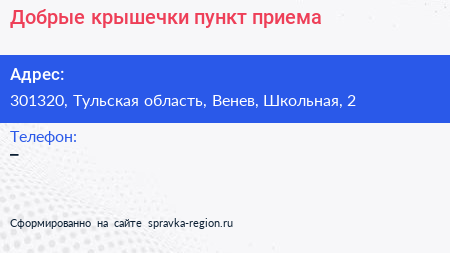 Добрые крышечки, пункт приема по адресу 301320, Тульская область, Венев, Школьная, 2 в дальнейшем Организация, размещена в следующих категориях:
