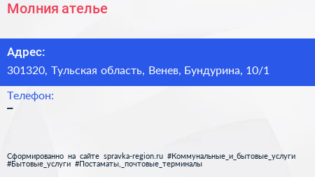 Молния, ателье по адресу 301320, Тульская область, Венев, Бундурина, 10/1 в дальнейшем Организация, размещена в следующих категориях: