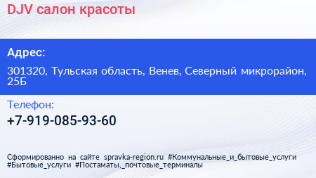 DJV, салон красоты по адресу 301320, Тульская область, Венев, Северный микрорайон, 25Б в дальнейшем Организация, размещена в следующих категориях: