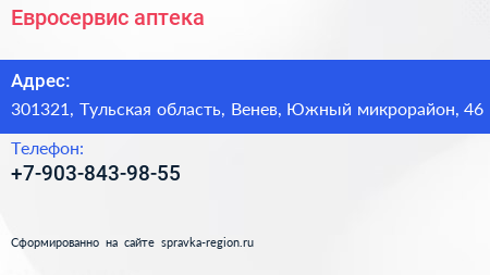 Евросервис, аптека по адресу 301321, Тульская область, Венев, Южный микрорайон, 46 в дальнейшем Организация, размещена в следующих категориях: