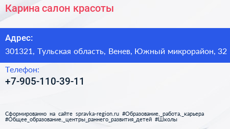Карина, салон красоты по адресу 301321, Тульская область, Венев, Южный микрорайон, 32 в дальнейшем Организация, размещена в следующих категориях: