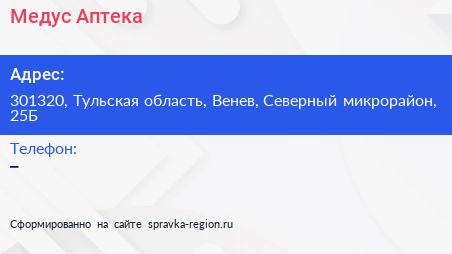 Медус, Аптека по адресу 301320, Тульская область, Венев, Северный микрорайон, 25Б в дальнейшем Организация, размещена в следующих категориях: