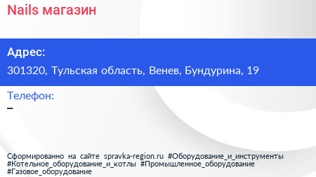 Nails, магазин по адресу 301320, Тульская область, Венев, Бундурина, 19 в дальнейшем Организация, размещена в следующих категориях:
