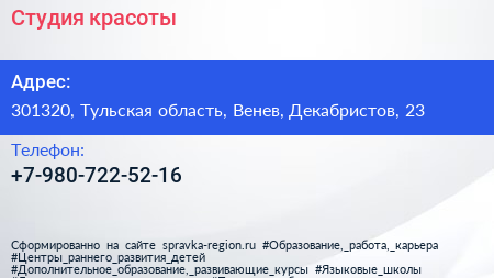 Студия красоты по адресу 301320, Тульская область, Венев, Декабристов, 23 в дальнейшем Организация, размещена в следующих категориях: