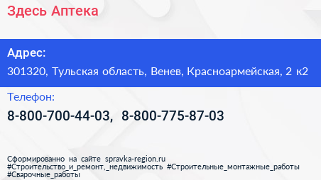 Здесь Аптека по адресу 301320, Тульская область, Венев, Красноармейская, 2 к2 в дальнейшем Организация, размещена в следующих категориях: