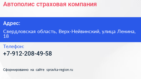 Автополис, страховая компания по адресу Свердловская область, Верх-Нейвинский, улица Ленина, 18 в дальнейшем Организация, размещена в следующих категориях: