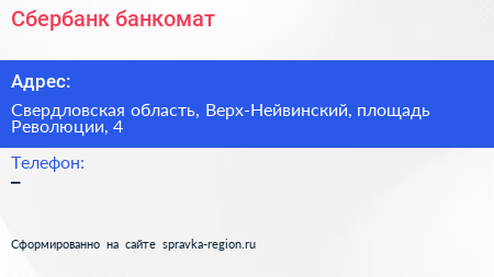 Сбербанк, банкомат по адресу Свердловская область, Верх-Нейвинский, площадь Революции, 4 в дальнейшем Организация, размещена в следующих категориях: