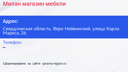 Милан, магазин мебели по адресу Свердловская область, Верх-Нейвинский, улица Карла Маркса, 26 в дальнейшем Организация, размещена в следующих категориях: