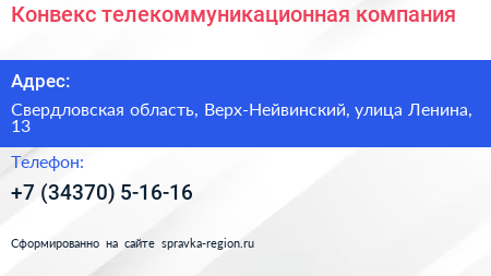 Конвекс, телекоммуникационная компания по адресу Свердловская область, Верх-Нейвинский, улица Ленина, 13 в дальнейшем Организация, размещена в следующих категориях: