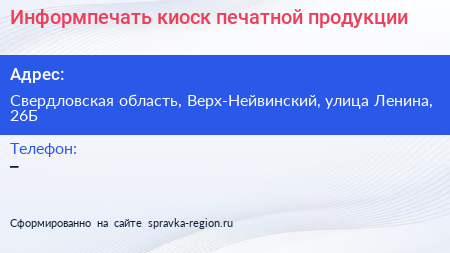 Информпечать, киоск печатной продукции по адресу Свердловская область, Верх-Нейвинский, улица Ленина, 26Б в дальнейшем Организация, размещена в следующих категориях:
