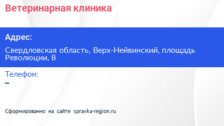Ветеринарная клиника по адресу Свердловская область, Верх-Нейвинский, площадь Революции, 8 в дальнейшем Организация, размещена в следующих категориях: