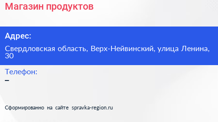 Магазин продуктов по адресу Свердловская область, Верх-Нейвинский, улица Ленина, 30 в дальнейшем Организация, размещена в следующих категориях: