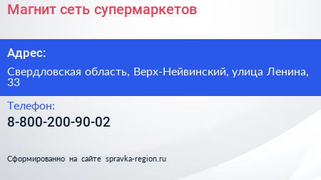Магнит, сеть супермаркетов по адресу Свердловская область, Верх-Нейвинский, улица Ленина, 33 в дальнейшем Организация, размещена в следующих категориях: