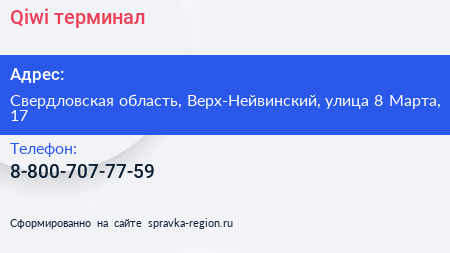 Qiwi, терминал по адресу Свердловская область, Верх-Нейвинский, улица 8 Марта, 17 в дальнейшем Организация, размещена в следующих категориях: