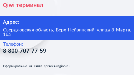 Qiwi, терминал по адресу Свердловская область, Верх-Нейвинский, улица 8 Марта, 16а в дальнейшем Организация, размещена в следующих категориях: