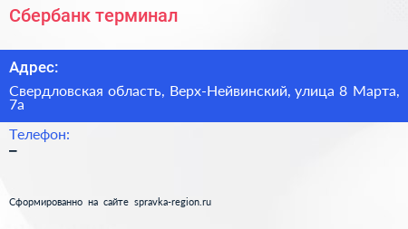 Сбербанк, терминал по адресу Свердловская область, Верх-Нейвинский, улица 8 Марта, 7а в дальнейшем Организация, размещена в следующих категориях: