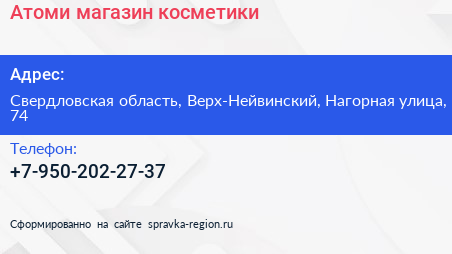 Атоми, магазин косметики по адресу Свердловская область, Верх-Нейвинский, Нагорная улица, 74 в дальнейшем Организация, размещена в следующих категориях: