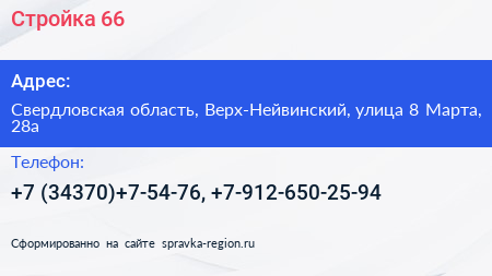 Стройка-66 по адресу Свердловская область, Верх-Нейвинский, улица 8 Марта, 28а в дальнейшем Организация, размещена в следующих категориях: