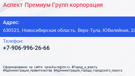 Аспект Премиум Групп, корпорация по адресу 630521, Новосибирская область, Верх-Тула, Юбилейная, 2а в дальнейшем Организация, размещена в следующих категориях: