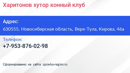 Харитонов хутор, конный клуб по адресу 630555, Новосибирская область, Верх-Тула, Кирова, 46а в дальнейшем Организация, размещена в следующих категориях: