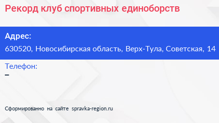 Рекорд, клуб спортивных единоборств по адресу 630520, Новосибирская область, Верх-Тула, Советская, 14 в дальнейшем Организация, размещена в следующих категориях:
