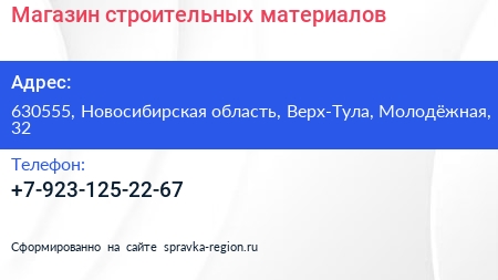 Магазин строительных материалов по адресу 630555, Новосибирская область, Верх-Тула, Молодёжная, 32 в дальнейшем Организация, размещена в следующих категориях: