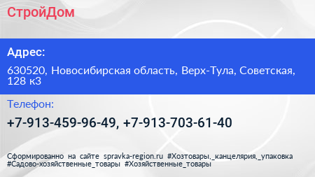СтройДом по адресу 630520, Новосибирская область, Верх-Тула, Советская, 128 к3 в дальнейшем Организация, размещена в следующих категориях: