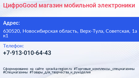 ЦифроGood, магазин мобильной электроники по адресу 630520, Новосибирская область, Верх-Тула, Советская, 1а к1 в дальнейшем Организация, размещена в следующих категориях: