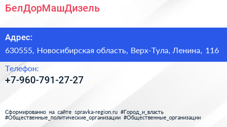 БелДорМашДизель по адресу 630555, Новосибирская область, Верх-Тула, Ленина, 116 в дальнейшем Организация, размещена в следующих категориях: