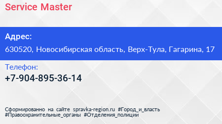 Service-Master по адресу 630520, Новосибирская область, Верх-Тула, Гагарина, 17 в дальнейшем Организация, размещена в следующих категориях: