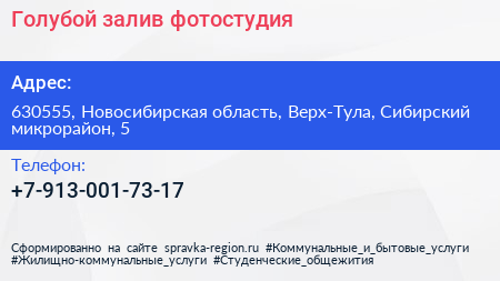 Голубой залив, фотостудия по адресу 630555, Новосибирская область, Верх-Тула, Сибирский микрорайон, 5 в дальнейшем Организация, размещена в следующих категориях:
