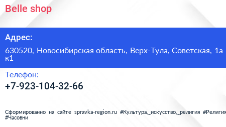 Belle shop по адресу 630520, Новосибирская область, Верх-Тула, Советская, 1а к1 в дальнейшем Организация, размещена в следующих категориях: