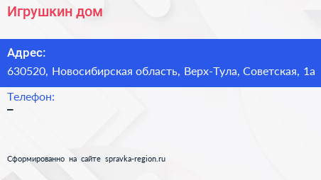 Игрушкин дом по адресу 630520, Новосибирская область, Верх-Тула, Советская, 1а в дальнейшем Организация, размещена в следующих категориях:
