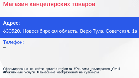 Магазин канцелярских товаров по адресу 630520, Новосибирская область, Верх-Тула, Советская, 1а в дальнейшем Организация, размещена в следующих категориях: