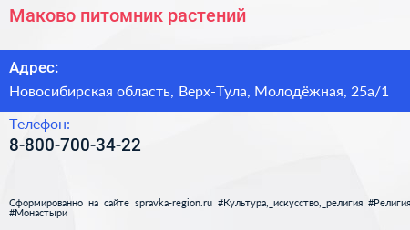 Маково, питомник растений по адресу Новосибирская область, Верх-Тула, Молодёжная, 25а/1 в дальнейшем Организация, размещена в следующих категориях: