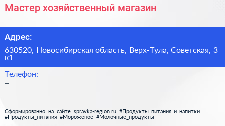 Мастер, хозяйственный магазин по адресу 630520, Новосибирская область, Верх-Тула, Советская, 3 к1 в дальнейшем Организация, размещена в следующих категориях: