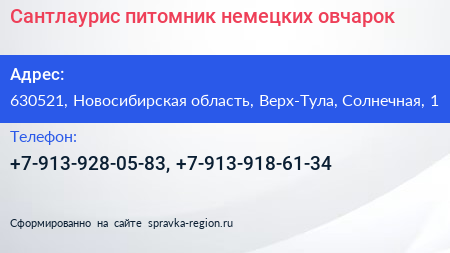 Сантлаурис, питомник немецких овчарок по адресу 630521, Новосибирская область, Верх-Тула, Солнечная, 1 в дальнейшем Организация, размещена в следующих категориях:
