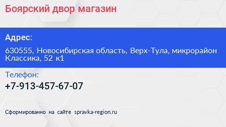 Боярский двор, магазин по адресу 630555, Новосибирская область, Верх-Тула, микрорайон Классика, 52 к1 в дальнейшем Организация, размещена в следующих категориях: