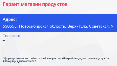 Гарант, магазин продуктов по адресу 630555, Новосибирская область, Верх-Тула, Советская, 9 в дальнейшем Организация, размещена в следующих категориях: