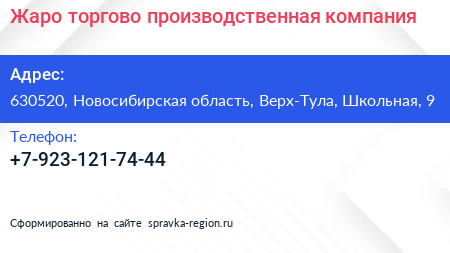 Жаро, торгово-производственная компания по адресу 630520, Новосибирская область, Верх-Тула, Школьная, 9 в дальнейшем Организация, размещена в следующих категориях: