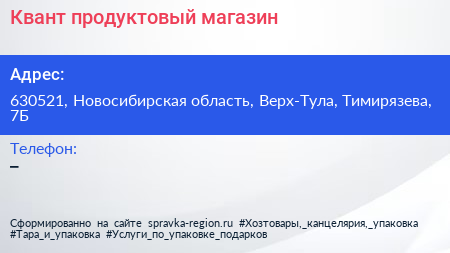 Квант, продуктовый магазин по адресу 630521, Новосибирская область, Верх-Тула, Тимирязева, 7Б в дальнейшем Организация, размещена в следующих категориях: