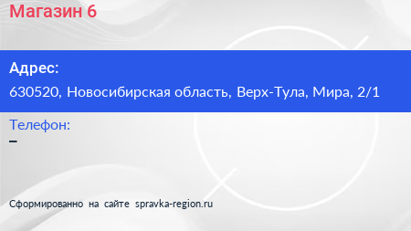 Магазин №6 по адресу 630520, Новосибирская область, Верх-Тула, Мира, 2/1 в дальнейшем Организация, размещена в следующих категориях: