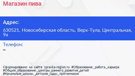 Магазин пива по адресу 630521, Новосибирская область, Верх-Тула, Центральная, 9а в дальнейшем Организация, размещена в следующих категориях:
